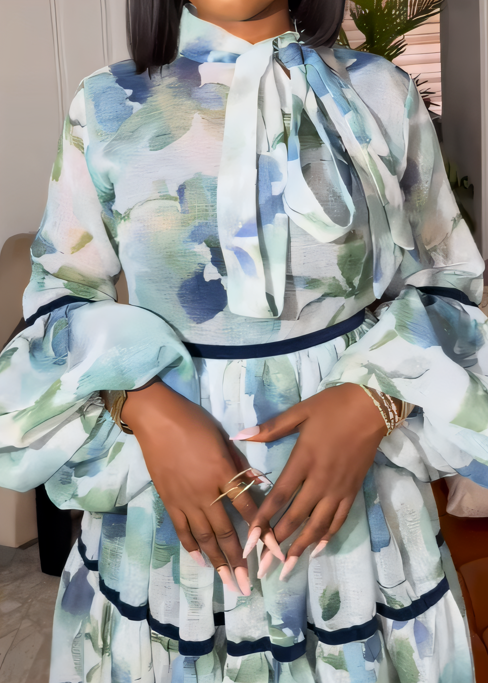 Lantern Sleeve Lace-Up Printed Dress